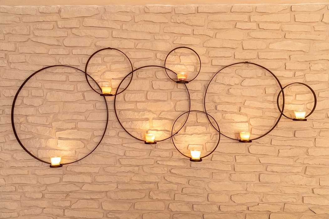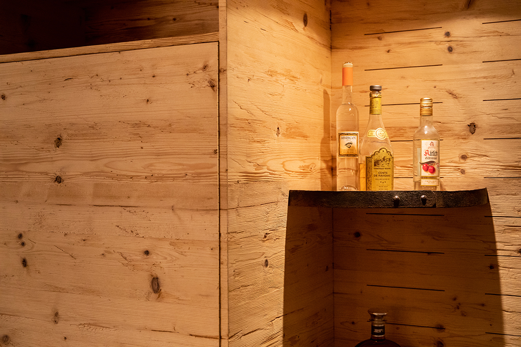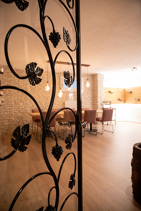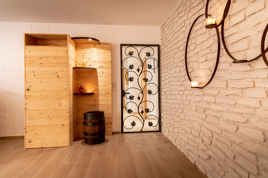 Le grand photophore mural, la porte ornementée de feuilles de vigne et de grappes participent de cette célébration de l’esprit du vin. Une réhabilitation qui distingue le savoir-faire d’artisans d’art amoureux de matériaux nobles et de belles finitions.
