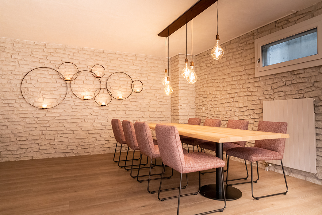 Cette ancienne cave vigneronne a été entièrement réagencée afin d'abriter des vins prestigieux et accueillir amateurs de bonnes bouteilles et de plats traditionnels. L’ambiance viticole d’antan s’accorde à des créations contemporaines comme la grande table d’hôtes surmontée de lampes à filaments ou encore l’armoire à vins intégrée dans un meuble réalisé sur mesure.
