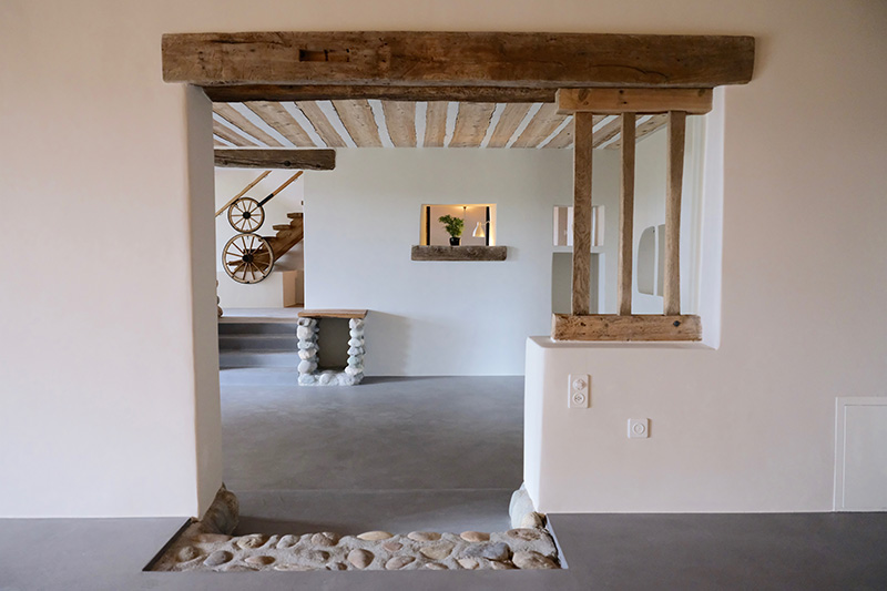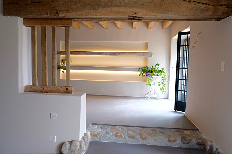 Du point de vue des espaces intérieurs, les matériaux existants tels que les poutres et les madriers ont été traités dans une approche contemporaine, en faisant réapparaitre l’aspect naturel du bois, de même pour les structures métalliques laissées visibles. Un enduit minéral a été appliqué sur l’ancien crépis rustique afin d’apporter une esthétique nouvelle, tout en préservant le charme d’antan.