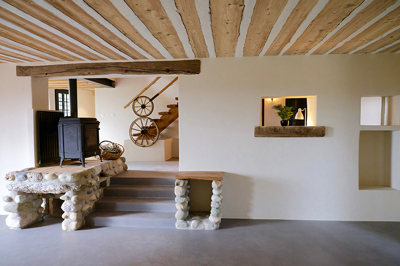 Lors de la rénovation de cette demeure de campagne, une attention particulière a été portée à l’amélioration de l’efficacité énergétique notamment par l’isolation de la toiture, l’installation de panneaux photovoltaïques et d’une PAC air/eau.