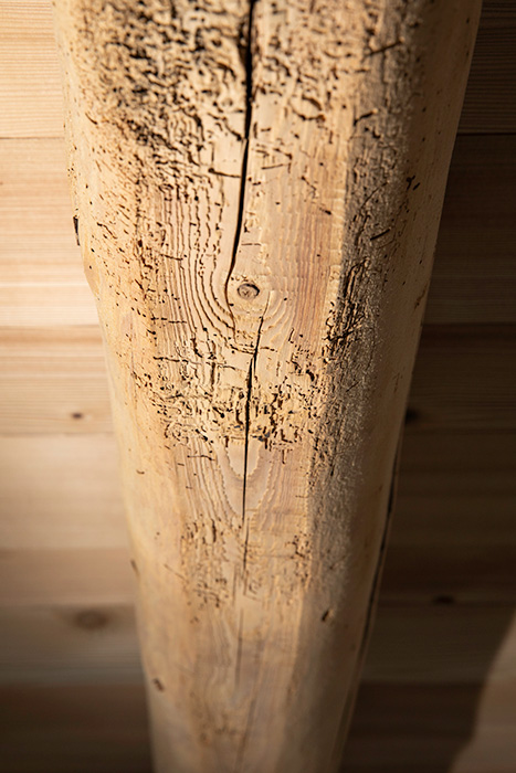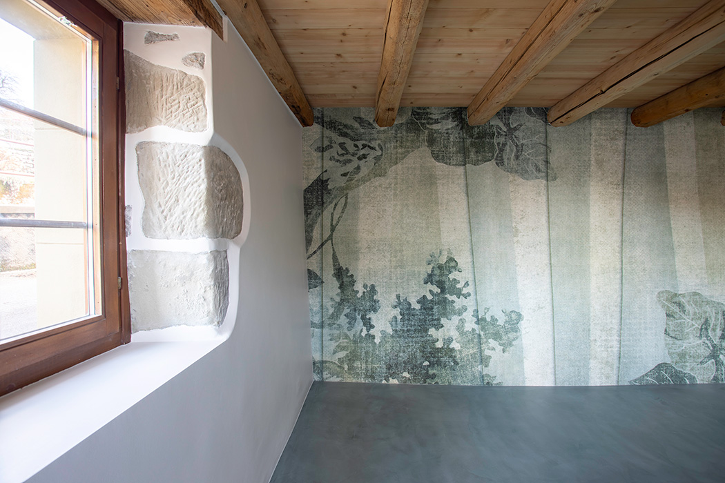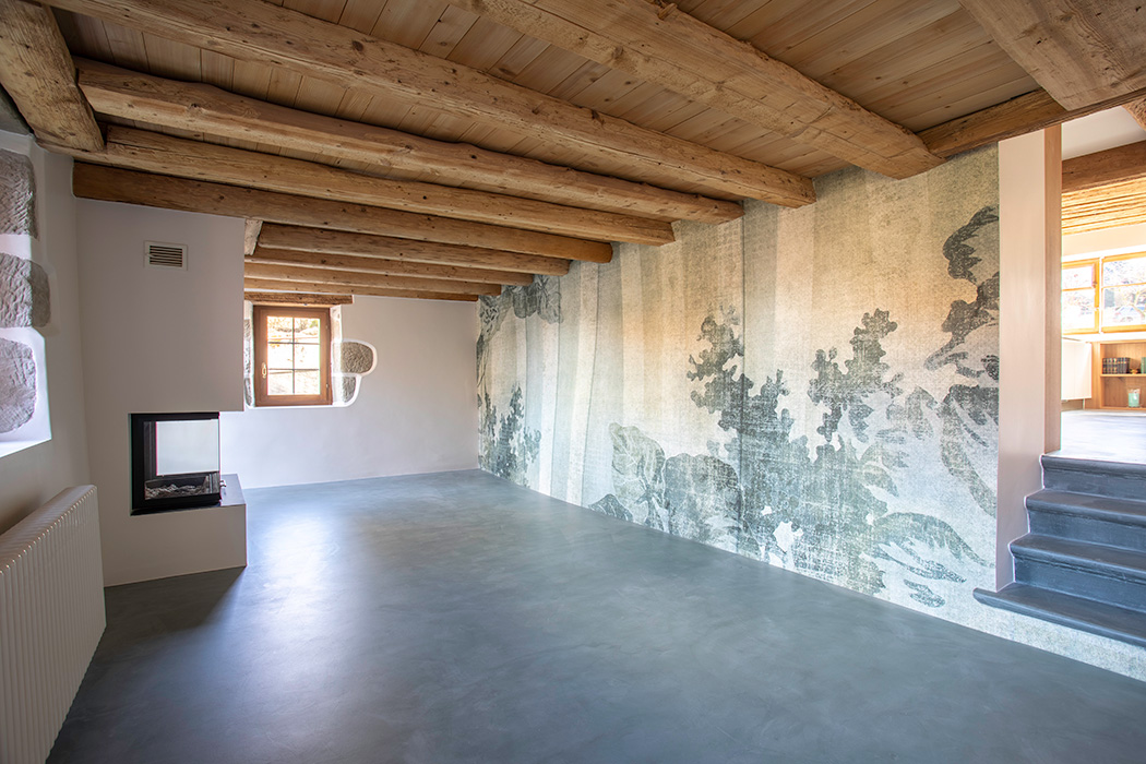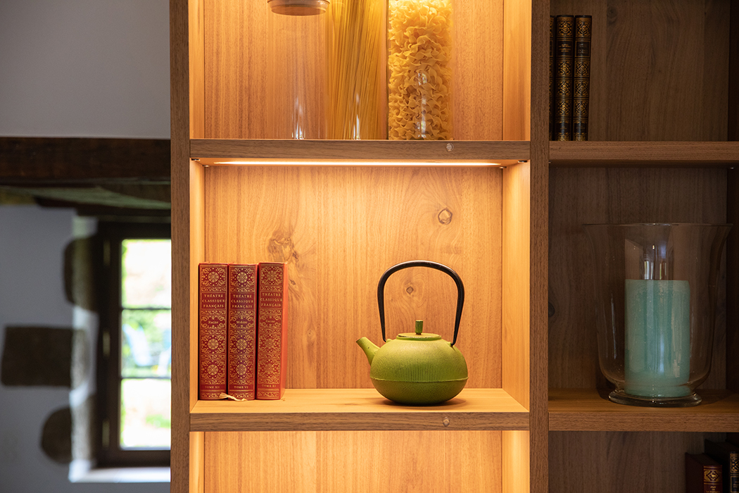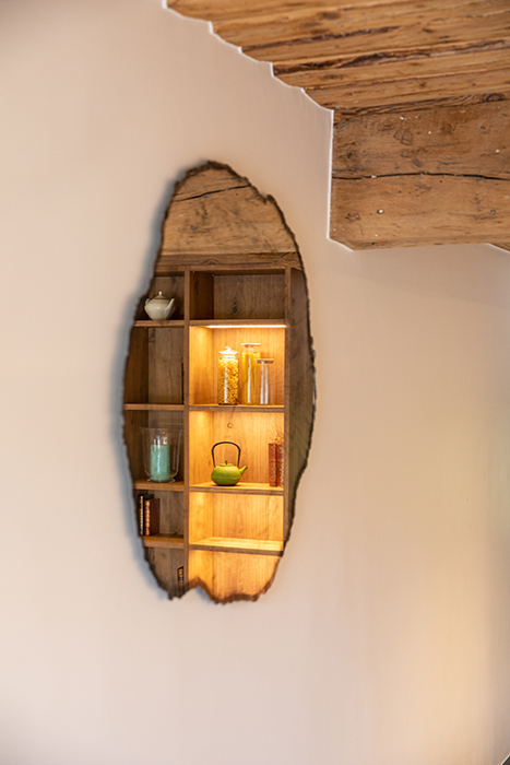 La réalisation d’un sol en béton ciré, l’agencement de niches rétro éclairées, un grand miroir en forme de tronc apportent une identité à cet espace et permet une transition harmonieuse avec le reste de l’habitation.