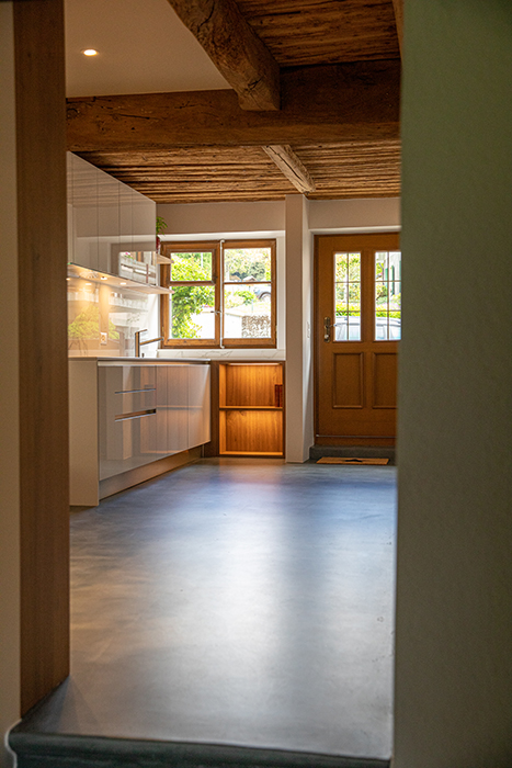 D’anciennes poutres découvertes sous un faux plafond ont été conservées et forment un contraste assumé avec une nouvelle cuisine design, aux lignes épurées (plan de travail et crédence marbre, façades laque brillante).