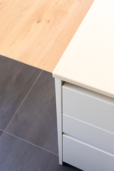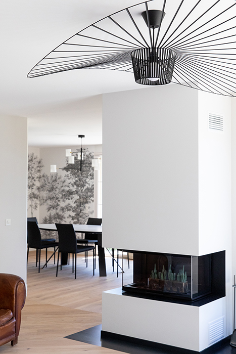 L'ancienne cheminée rustique a été remplacée par un foyer entièrement vitré qui marque le passage entre la salle à manger et le salon. Au sol, un parquet de grandes lames en chêne huilé d’aspect naturel unifie le rez-de-chaussée et s’harmonise à l'ardoise de la cuisine.