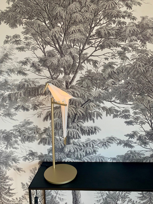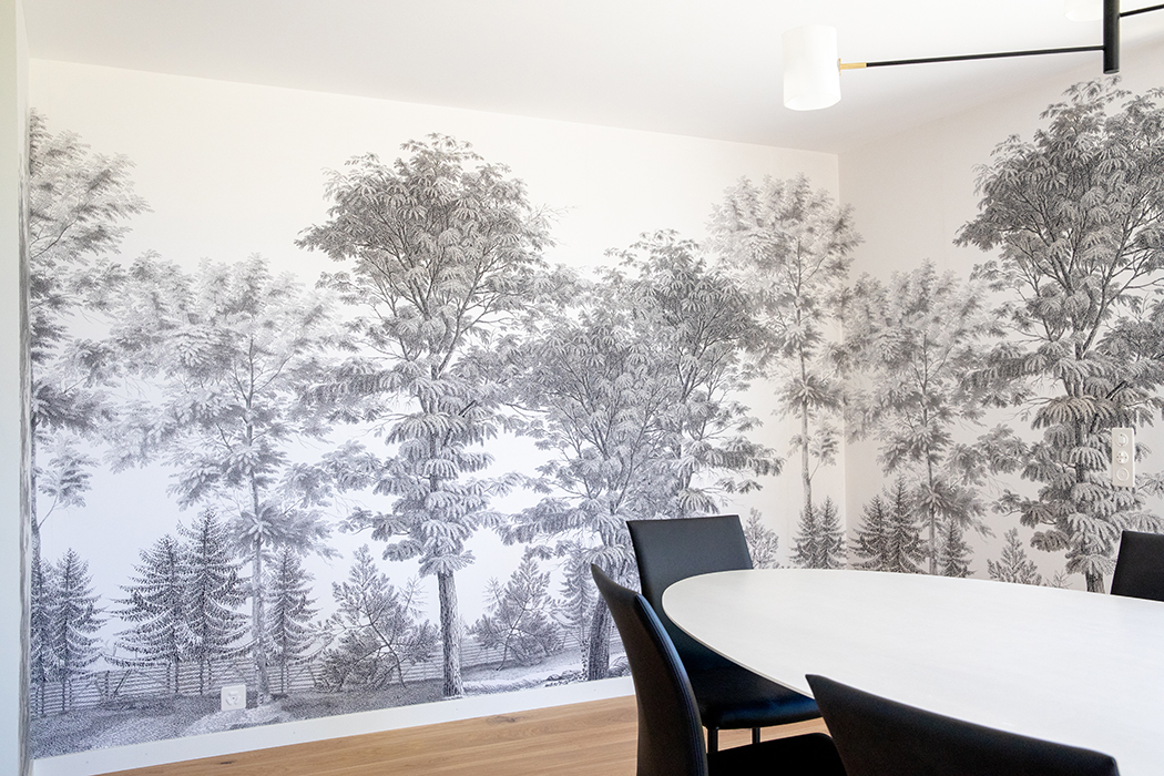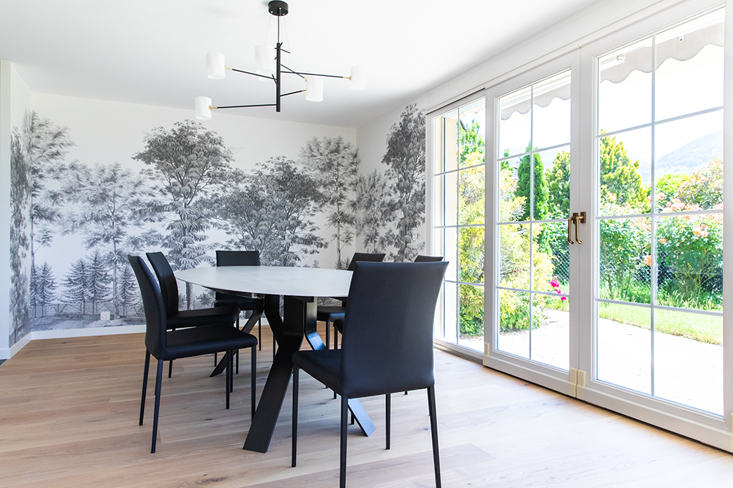 Dans la salle à manger, le jardin extérieur s’invite à l’intérieur avec un papier peint panoramique d’une élégante modernité.